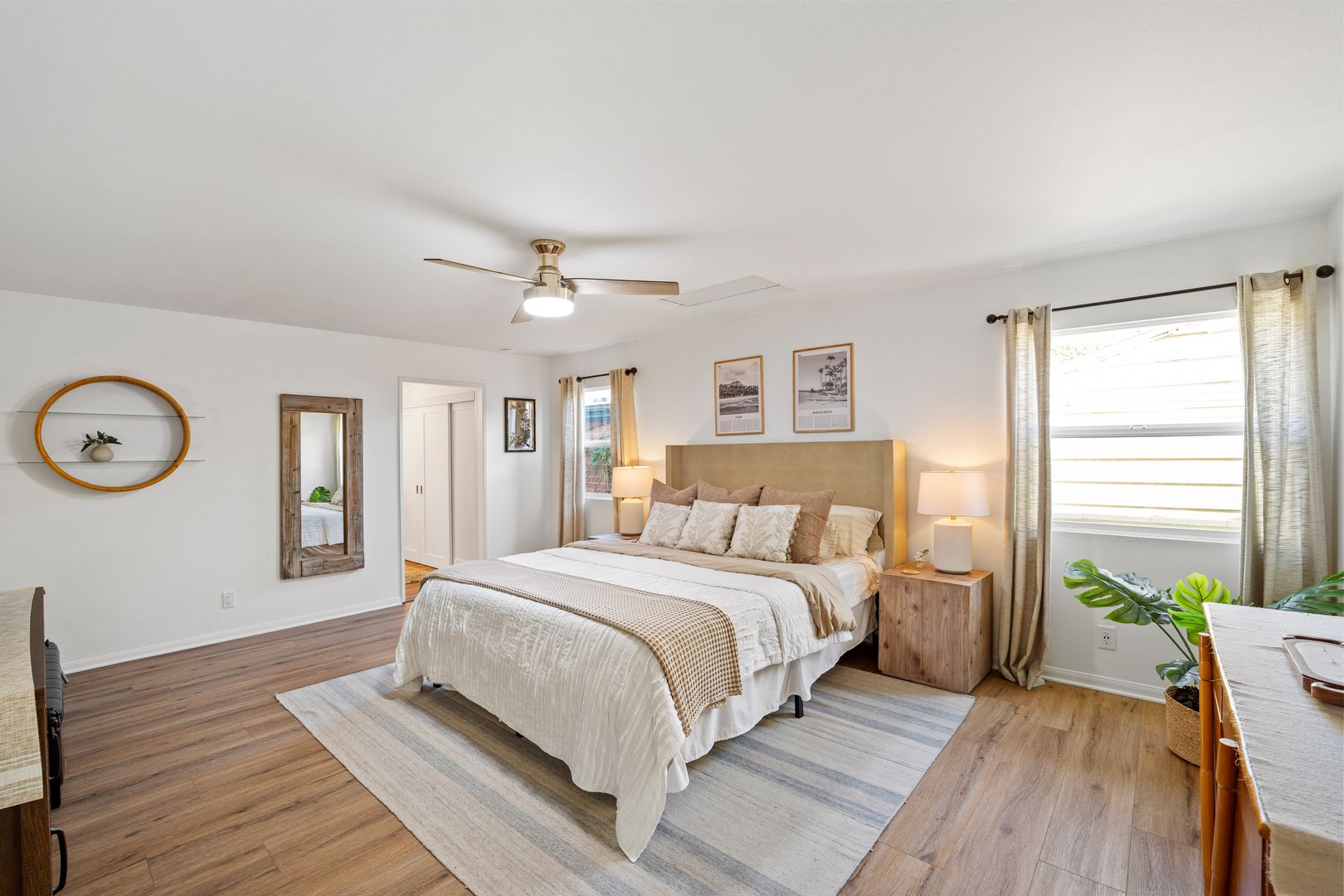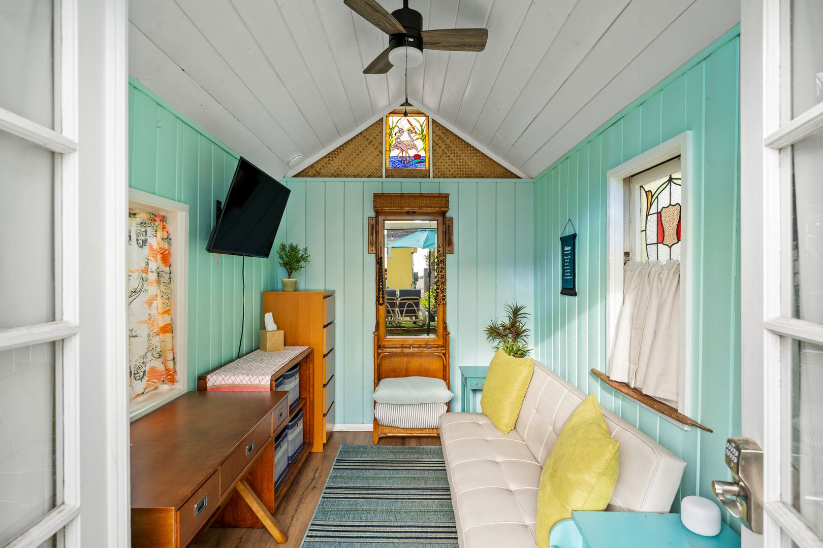 The second bedroom is a unique and private detached room just steps away from the main house via a covered patio and views of the courtyard. The newly renovated guest bathroom is in the main house, next to the entryway. There is an additional detached office room with French doors and views of the courtyard.