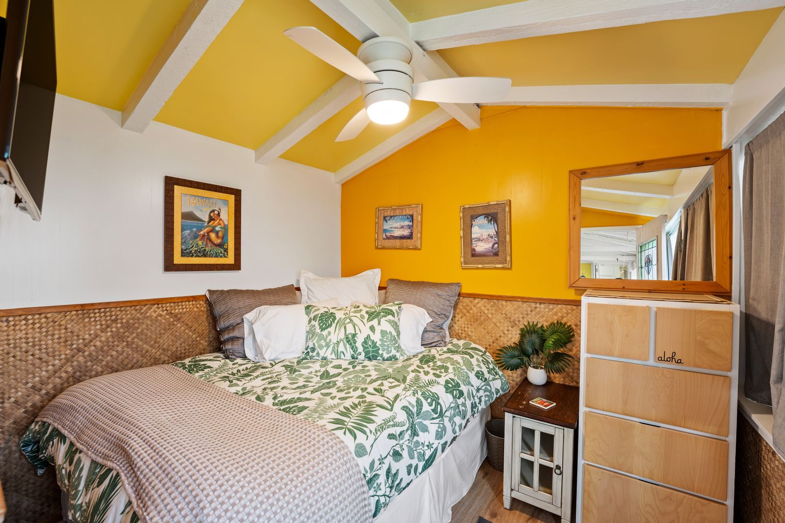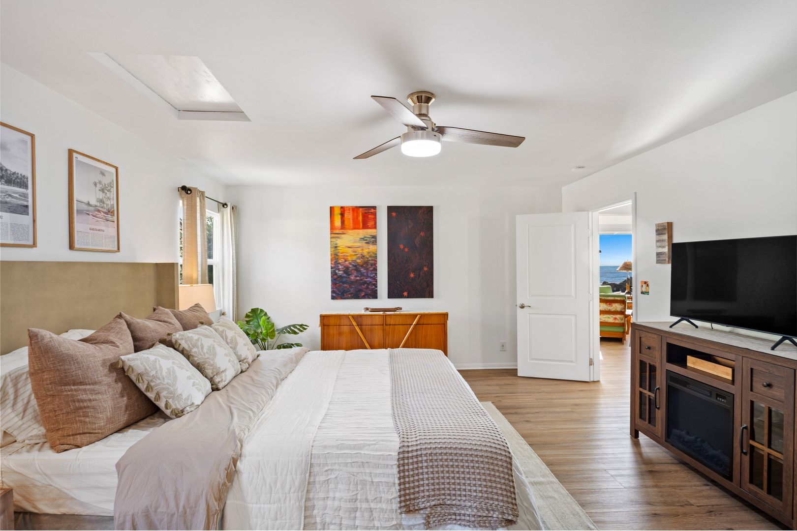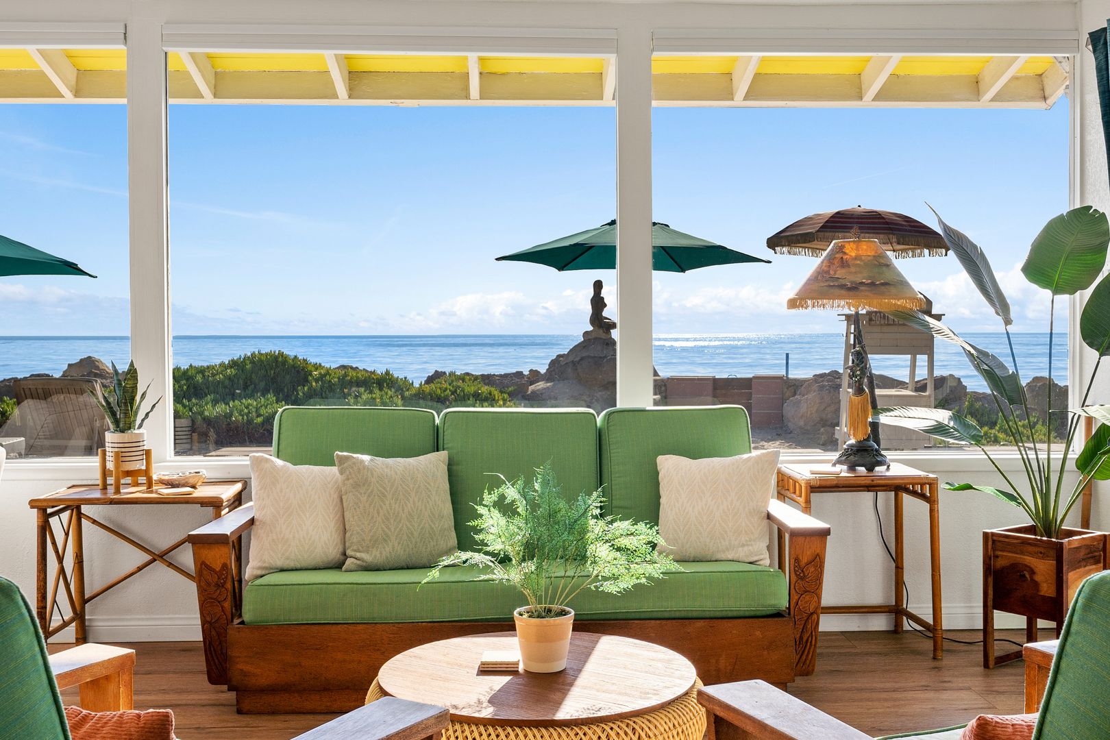This Hawaiian Beach Style home features a fully furnished 2-bedroom, 2 bath cottage (sleeps 4). The main house includes a large primary bedroom (king bed) with a walk-in closet and newly remodeled ensuite bathroom. The kitchen, dining & living room boast ocean views with a welcoming and comfortable open floor plan. Enjoy relaxing in the living room that includes a large corner gas fireplace, perfect for keeping warm on colder nights – all while taking in the panoramic ocean views!