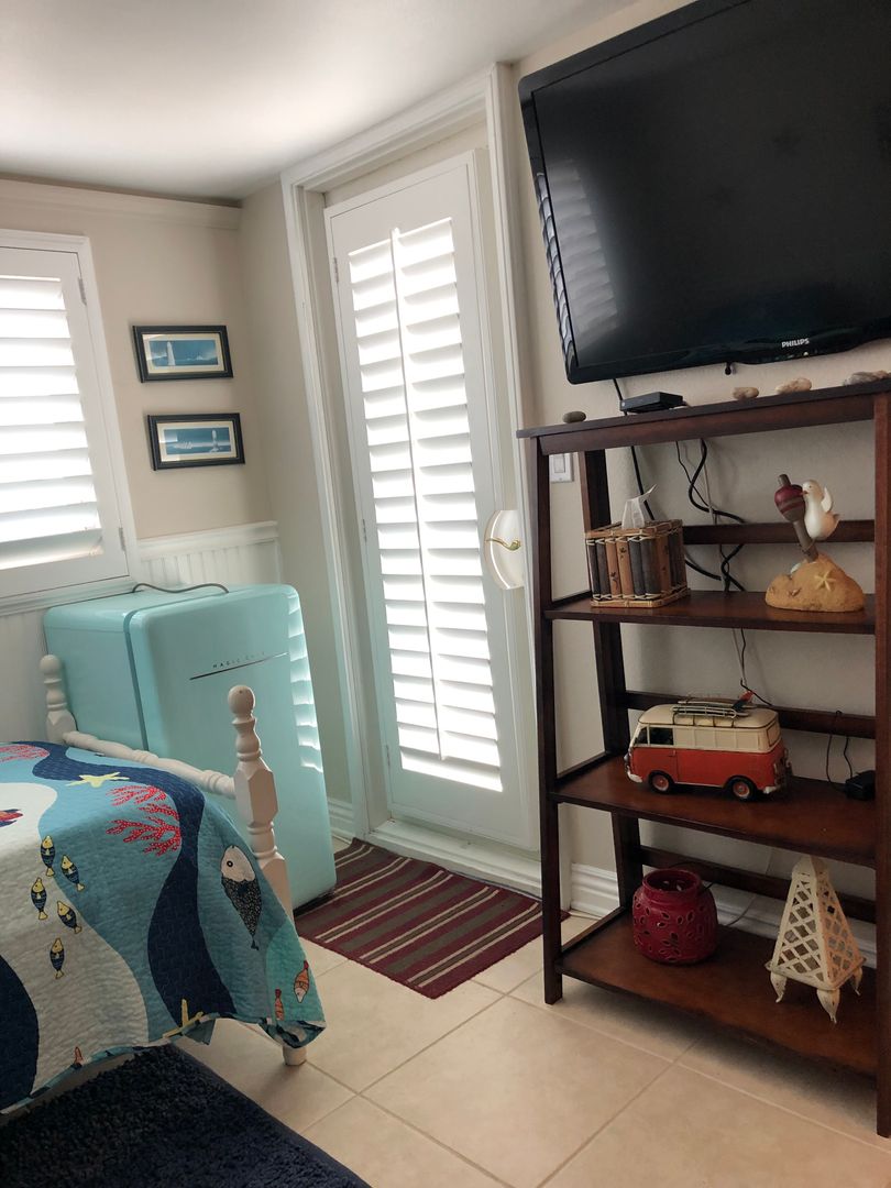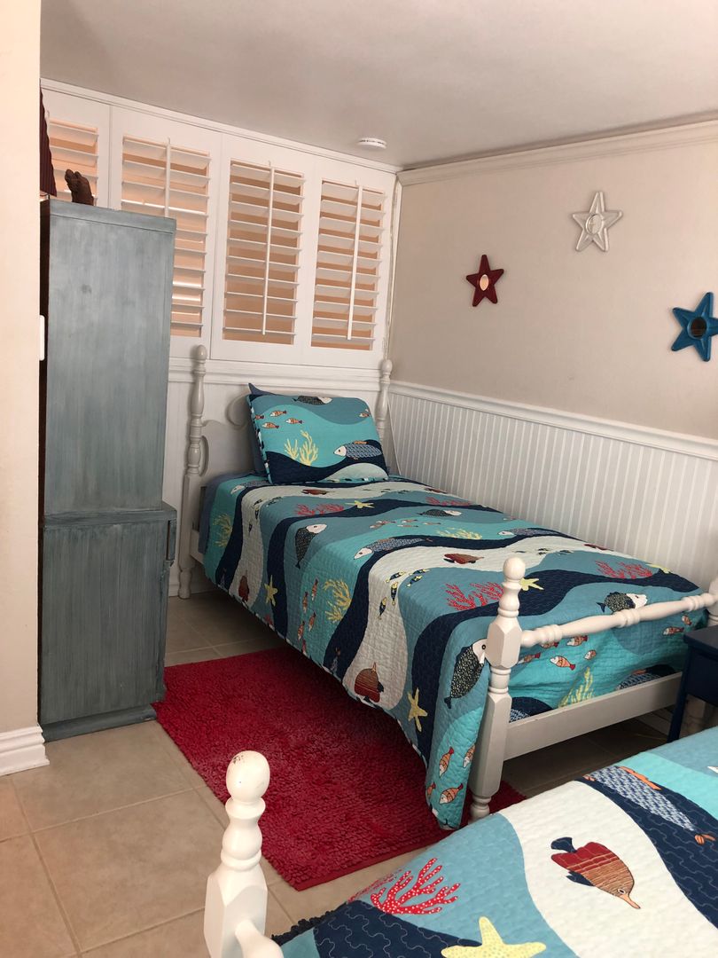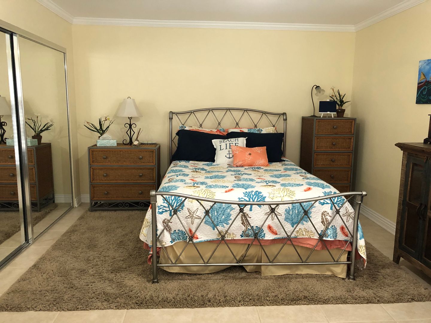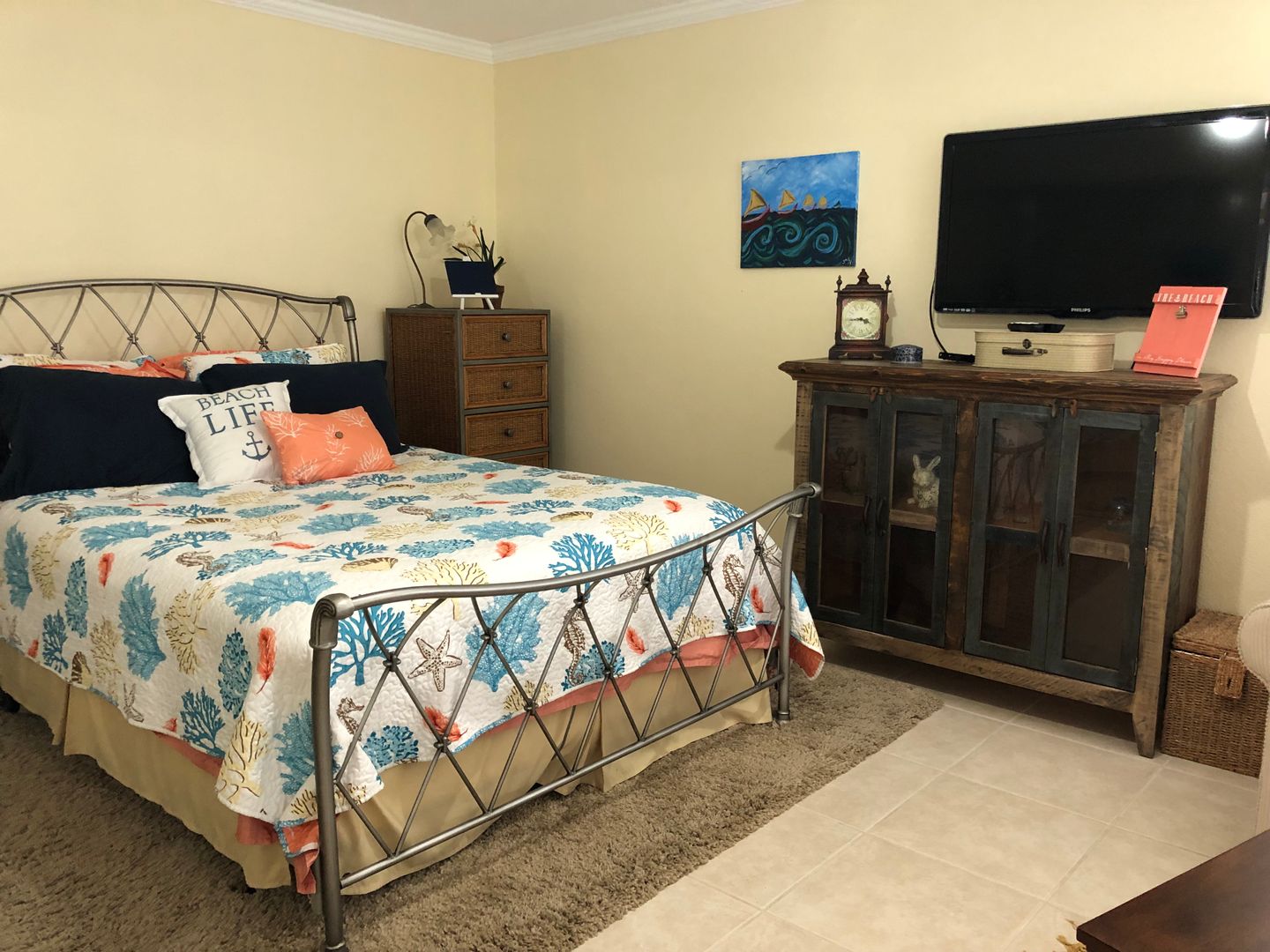 Both bedrooms are located on the second level with ceiling fans to keep you comfortable and private balconies overlooking Nautilus Street. The spare bedroom has a queen size bed, spacious closet space and cozy living area, complete with a loveseat! The master bedroom offers a king size bed, a walk-in closet, direct access to your private balcony and a private shower. The full bathroom, which includes a shower over tub is located next to the master bedroom.