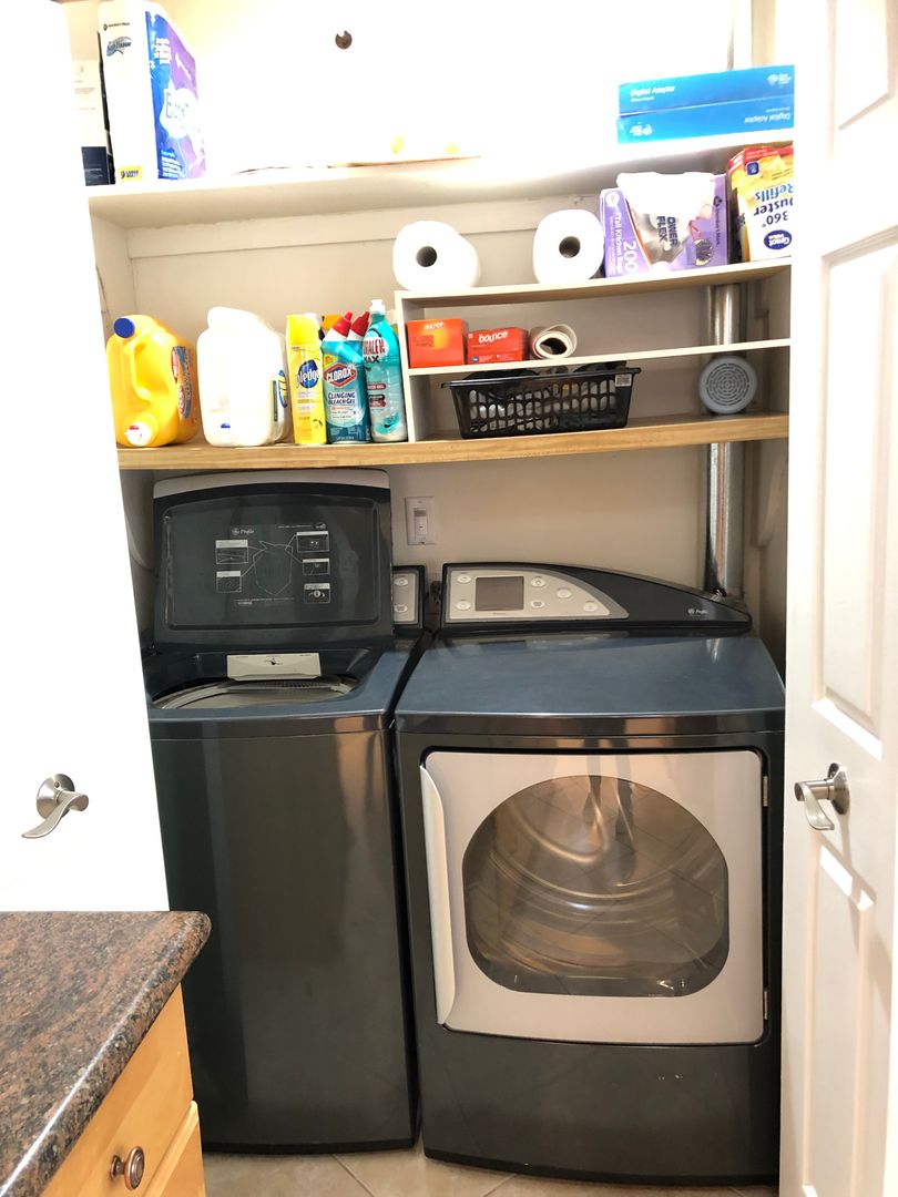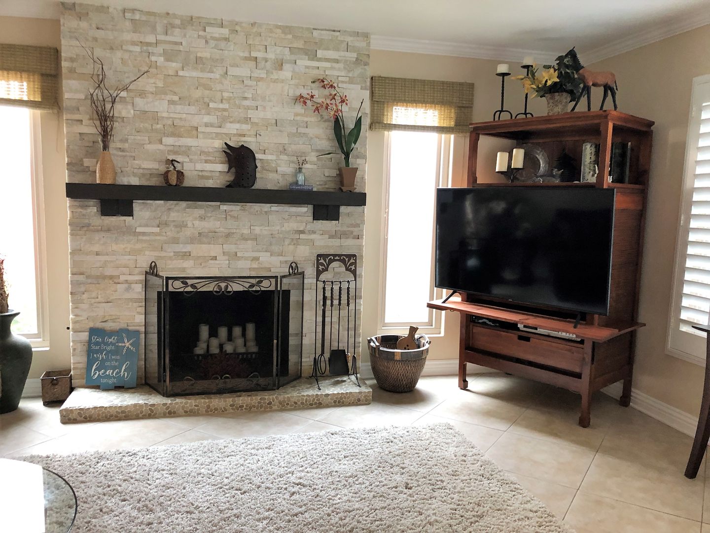 A washer and dryer are provided and located in a closet in the open kitchen. Down the hallway you will find the powder room and living room. The living room has a decorative fireplace, a flat screen TV and plenty of seating space in the sectional couch.