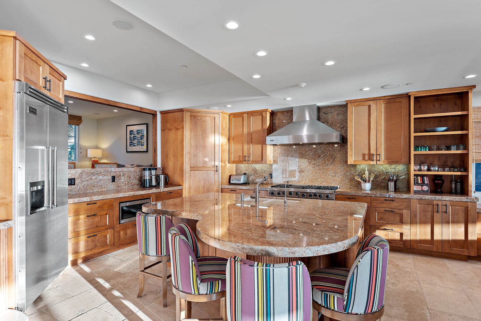 The home features 4 bedrooms, 4 bathrooms and a convenient family room space that doubles as an office, den or spare bedroom. Two luxury primary suites overlook the ocean, each with a king size bed, fireplaces, walk-in closets and elegant ensuite bathrooms. The gourmet kitchen is equipped with chef-grade stainless steel Viking appliances and is fully stocked with all the cooking tools you will need for your stay. Custom accents are abundant throughout from the sweeping teak staircase to custom hand-carved teak bedroom doors. An elevator provides access from the garage to the rooftop deck and all living spaces in between.