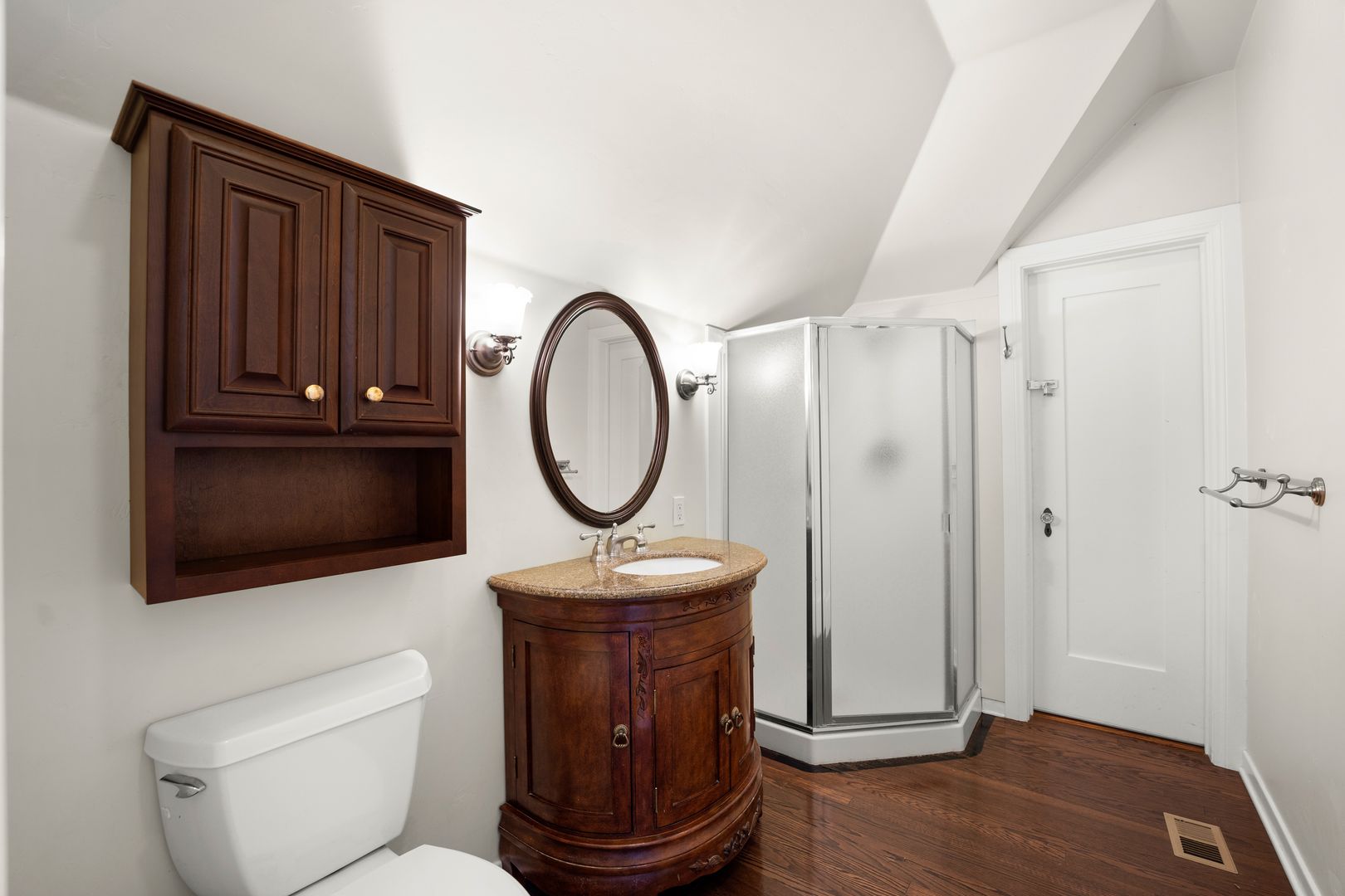 Hard wood flooring extends throughout the first level up the grand staircase. Upstairs are two additional bedrooms, both with plenty of closet space and a shared bathroom with granite countertop vanity and walk-in shower.