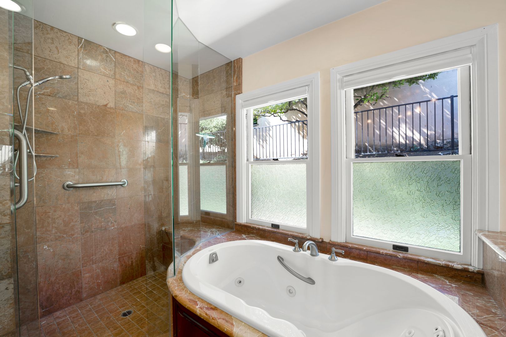 The second downstairs bedroom offers a patio with an ocean view and includes a queen size bed and plenty of closet space. The downstairs guest bathroom includes an antique clawfoot tub and a separate walk-in shower.